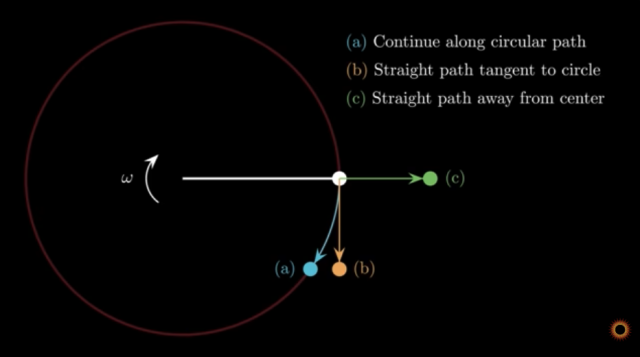 Thus, what Prof. Jackson alluded to, but should have said explicitly, is that the behavior of the ball approaches answer (b) as the behavior of the object holding the ball approaches that of the idealized string. Further, the ball does begin traveling in a straight line the instant the force from what's holding it disappears, just as Newton's laws predict. The "mind-blowing aspect of circular motion" turns out to be more about semantics than physics.