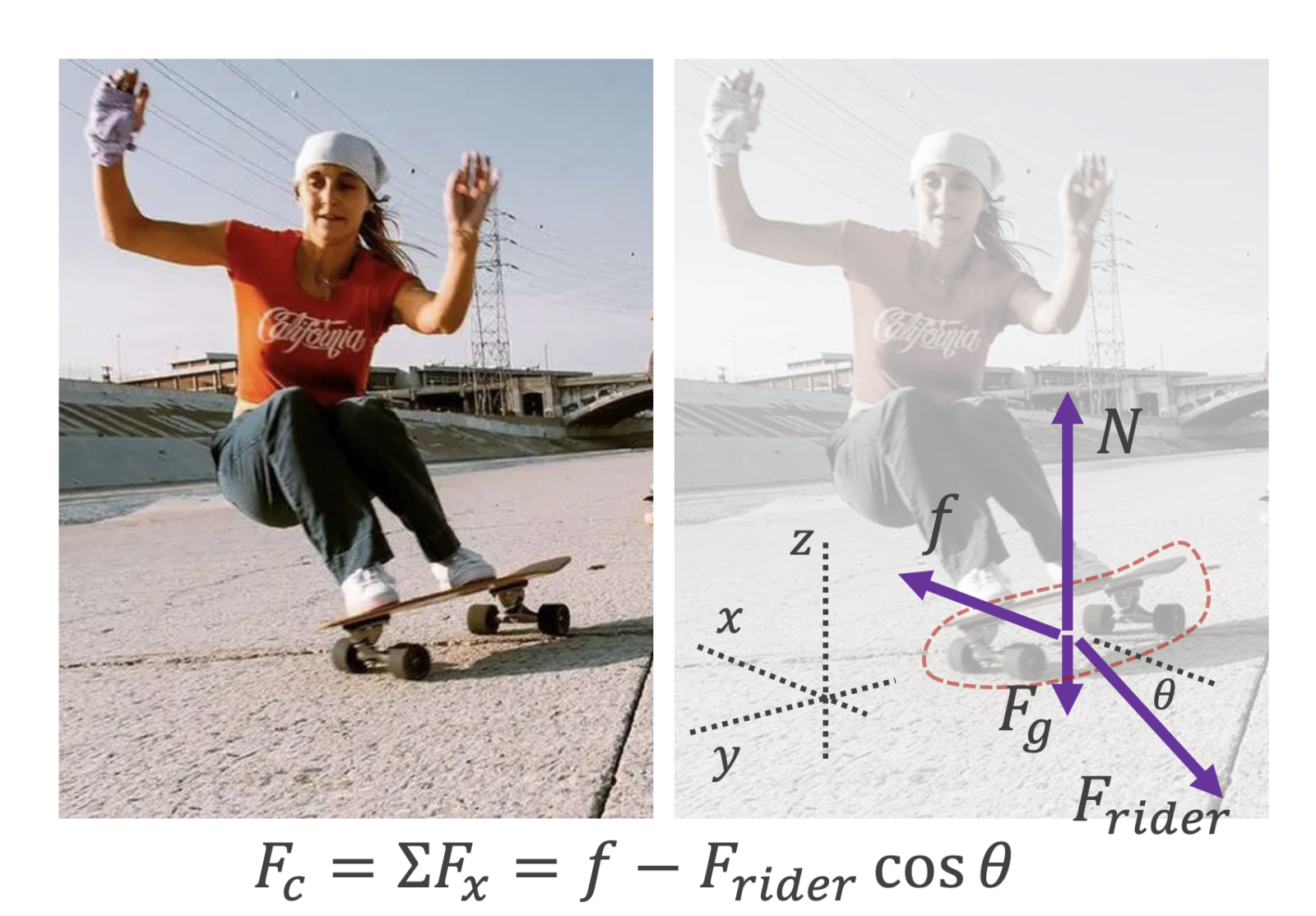 So why does the skateboard "follow us into the turn?" Let's model the skateboard as an object. It experiences a force from the rider down and to the outside of the turn. Normal force from the ground points up, gravity (on the board itself) pulls down, and friction points inward, since the board is being pushed outward by the rider. It's not obvious, though, that the friction inward would be greater than the rider's outward push, a condition which is necessary to create a centripetal force on the skateboard.