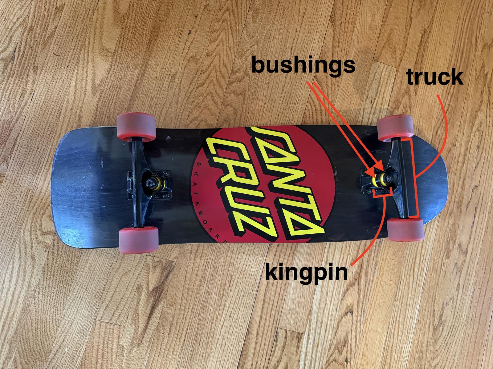 It turns out skateboards need a mechanism to generate centripetal force, in the form of friction. That mechanism is in the trucks, the assemblies that connect the wheels to the skateboard. The trucks are designed to respond to a skateboard leaning to one side by turning the wheels into the lean, angling them not unlike turned front wheels on a car. And like wheels on a car, the angle creates friction which forces the skateboard inward.