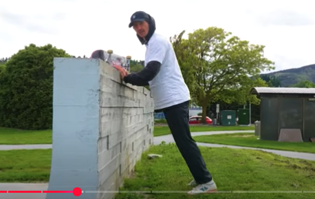 Mitchie demonstrates the correct posture for an aggressive toe-side carve (turn) with the help of a cinderblock wall.